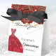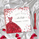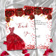 For a Quinceañera, 15h birthday party. A black background with red sparkles, confetti, a red dress. The name is written with a modern hand lettered style script with swashes. Personalize and add a name and date.