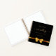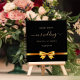 A stylish black background with a golden ribbon and bow. Personalize and add your names and wedding date.