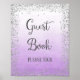 Poster print for guest book wedding sign with faux silver glitter design and ombre purple watercolor background.