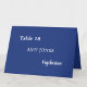 Guest Name Meal Choice Dark Blue Place Card featuring stylish white text on a dark blue background. Please use the online personalization template to personalize each place card individually before adding the card to the cart, to show the table number for the particular table where the guest is to be sitting, the name of the guest and the meal choice (or dietary restriction) for the guest. (Repeat the personalization process for each card you wish to purchase, adding the card to the cart individually each time). This printed place card will arrive flat and so will need folding in half before use. (The size before folding is approximately 5" height by 3.5" width, intended to be folded so approximately 2.5" by 3.5" after folding). Once the printed card is folded, the same wording will show on both sides (so as to be visible from both sides of a table). A neatly-personalized place card for a stylish wedding or other special occasion.