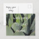 Welcome guests to your southwest home or your house rental with this postcard featuring a botanical photo that captures the beautiful green leaves of an agave plant. These large layered leaves are very thick and display small thorns along their edges that help to protect this southwest desert plant. "Welcome To Our Home" and "Enjoy Your Stay" can quickly be personalized to suit your needs.
