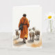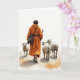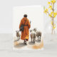 This design shows a lone traveler in a sunlit orange robe walking away from the viewer across a pale, almost white open space, with a small satchel across one shoulder and a sturdy staff in hand. Three woolly animals with creamy coats move alongside, two trailing behind in step as if trusting the path being set. One animal stands slightly to the left and turns its head back, meeting the viewer’s eyes with a gentle look that suggests friendship and steady companionship 🐇. Soft, diffused light washes over everything, giving the scene a calm, quiet mood and letting the warm robe color stand out against the minimal background. A short Easter greeting is placed near the top in a light, warm tone, with a smaller line of text beneath it in a softer shade for balance 🌷. The ground is a muted sandy color with faint texture, and long, subtle shadows stretch behind the traveler and the three animals. The wide white space around the figures makes their closeness feel tender, like a shared journey where no one is left behind. The orange robe forms the strongest color in the image, and the staff angles slightly forward while the animals’ shadows taper across the sand.