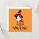 Cute black, white and tawny Guinea Pig (genus Cavia; aka "cavy") wearing a purple Halloween witches hat and carrying a pumpkin faced goody bag. Words "trick or treat" below image. Original art of artist Margaret Loftin Whiting.