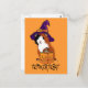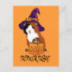 Cute black, white and tawny Guinea Pig (genus Cavia; aka "cavy") wearing a purple Halloween witches hat and carrying a pumpkin faced goody bag. Words "trick or treat" below image. Original art of artist Margaret Loftin Whiting.