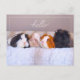 Guinea Pig Postcard. This cute cavy postcard features a tortoiseshell silkie, a grey and white crested with red eyes, a white and orange American, and a black texel guinea pig sitting together on a soft blanket. Above the word “hello” is customizable. Exchange it with a name, thank you message, or leave it how it is. Wonderful postcard for kids, guinea pig lovers, guinea pig pet owners, and animal lovers.