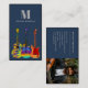 Guitar music teacher business card with photo template and modern typography. Colorful psychedelic guitar illustrations on a blue background complete with personalized monogram, name, details and photo template. The perfect cool business card design for guitarists, professional musicians, entertainers, songwriters and music teachers. Original artwork by artist Catherine Sweetman
