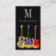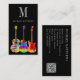 This vibrant business card features psychedelic acoustic, semi-acoustic, and electric guitars in a dazzling array of colors against a striking black background. Complete with a personalized monogram, your name, contact details in stylish typography and a convenient website QR code, all rendered in stylish typography, this card is the perfect cool and colorful introduction for guitar teachers, guitarists, professional musicians, entertainers, and music teachers. Original artwork by artist Catherine Sweetman.