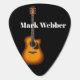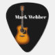 This guitar pick is shown with a guitar print on a black background color and a sample custom name, customize and change the name to yours.