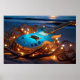 This poster is shown with a photo print of a guitar on the beach surrounded by lights.