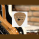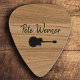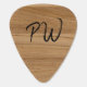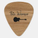 Rustic wooden texture (just an image of wood) at the background, with graphic silhouette of a black guitar, personalized with his name and initials (handwritten font style)... a nice idea for a stylish guitar.player... Having custom guitar picks with your name or logo is a great idea for branding, promotions, selling...