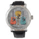 Wristwatch for a guitar player with a rustic design. Gray barn wood background with three acoustic guitar images in orange, yellow and blue. White numbers around the edge and band selections to customize as you wish. This masculine watch is the perfect choice for any musician or music lover.