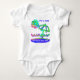 Created in a bright colorful fingerpaint style, this cute design includes a beach umbrella, waves and sun. Your child's name is over the umbrella and below, in an ocean blue template, there is another template for text. The bottom template now reads: Gulf Shores beach baby. All text on this fun travel novelty bodysuit is customizable. Your cutie will be absolutely adorable in this sweet one piece.