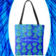 Gulf Shores, AL pretty scallop shell tote bag. A beautiful nature design, featuring a scallop shell pattern with a dramatic bold blue background which appears to glow. The shells are a light turquoise, which pop against the vibrant background. This stylish souvenir is the perfect way to show your love for amazing Gulf Shores, Alabama.