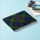 Clan Gunn crest badge surrounded by a strap and buckle over tartan background. Custom front, back and spine text.