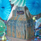 This is based on classic nature painting artworks by Gustav Klimt, Beech Grove 1, 1902. The artwork portrays a dense forest of tall, slender birch trees, with pale trunks marked by dark, vertical lines. The foliage is depicted in shades of blue, green, and yellow, adding a sense of depth and vibrancy to the scene. The forest floor is covered in a layer of orange and brown leaves, creating a striking contrast with the lighter tree trunks. The overall composition uses pointillist and impressionistic techniques, giving the image a lively, textured appearance. The verticality of the trees emphasizes the serene and rhythmic structure of the forest.
