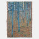 This is based on classic nature painting artworks by Gustav Klimt, Beech Grove 1, 1902. The artwork portrays a dense forest of tall, slender birch trees, with pale trunks marked by dark, vertical lines. The foliage is depicted in shades of blue, green, and yellow, adding a sense of depth and vibrancy to the scene. The forest floor is covered in a layer of orange and brown leaves, creating a striking contrast with the lighter tree trunks. The overall composition uses pointillist and impressionistic techniques, giving the image a lively, textured appearance. The verticality of the trees emphasizes the serene and rhythmic structure of the forest.
