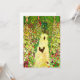 Card featuring Gustav Klimt’s oil painting Garden with Roosters (1917). Two brown chickens stand on a garden path. Beautiful pink, red, and white flowers bloom along the path. A great gift for fans of Art Nouveau and Austrian art.