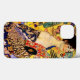 iPhone Case featuring Gustav Klimt’s oil painting Lady with Fan (1918). A woman wearing a blue kimono holds a red fan against a colorful yellow background of flowers and peacocks. A great gift for fans of Japonisme and European art.