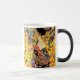 Magic Mug featuring Gustav Klimt’s oil painting Lady with Fan (1918). A woman wearing a blue kimono holds a red fan against a colorful yellow background of flowers and peacocks. A great gift for fans of Japonisme and European art.