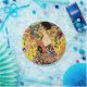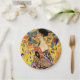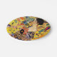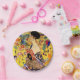 Paper Plates featuring Gustav Klimt’s oil painting Lady with Fan (1918). A woman wearing a blue kimono holds a red fan against a colorful yellow background of flowers and peacocks. A great gift for fans of Japonisme and European art.
