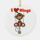 A stick figure monkey gymnast on the rings and text that reads "I (heart) Rings" on gymnastic design T-shirts, hoodies, mugs, cards, stickers, tote bags, and other gymnast apparel and gifts.