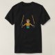 Gymnast athlete stretches arms out and holds on to pair of gymnastic rings. Legs are raised and the pose held steady on the gym rings.