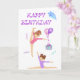 Personalize this cute gymnastics themed card with a name AND the age on the aqua star in the top corner. The design has two gymnasts wearing pink and purple, surrounded by party confetti and balloons and a gift. The inside is blank to add your desired message.