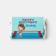 These cute custom girls gymnastics birthday party Hershey's Miniatures feature a pretty brunette gymnast girl standing in front of a beam. She is wearing a red leotard and smiling to next to her name personalized in beautiful blue writing on this chocolate party favor.