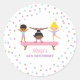 Flip, Tumble, Jump and Play! Gymnastics birthday party stickers in pink, purple and blue pastel colors.