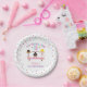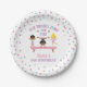 Flip, Tumble, Jump and Play! Gymnastics birthday party plates in pink, purple and blue pastel colors.