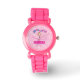 Gymnastics Pink hula hooping girl Custom name Silicon Wrist Watch. Cute gift for gymnastic girls: Cool curvy Gymnastics text in pink and blue with Pink hula hoop and smiling gymnast girl dressed in pink. You can change background color and text.