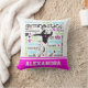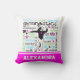 Gymnastics typography throw pillow. Lots of gymnastics words surround this adorable gymnast. It has decorative stars and a custom text field for you to add your own name! The colors are bright in pink, blue, and green to accent the black.