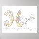 Pretty H monogram art name poster perfect for a girls bedroom or playroom in shades of gray, white, yellow, pink and purple. Personalize with your child's own name beginning with H, and name meaning for a truly personalized unique gift for your child's bedroom or nursery, this example is for the name Hazel Nut tree. A strong beauty with healing powers. Cute poster print ideal for a girls bedroom or to gift for a new baby, christening or baby shower gift. Artwork and design also available on other matching products. © Unique letter H monogram hearts and flowers drawing and graphic art design by Sarah Trett. www.sarahtrett.com for www.mylittleeden.com