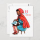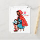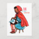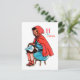 A young girl sits smiling and snug in a red hooded cape with a basket of treats upon her knee.