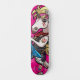 A skateboard deck featuring a fierce pouting unicorn in 80s hair metal gear (a smaller version of the full cartoon is inset at one end). Accessorised beyond reason, with sparkling blue star guitar, zebra print leggings and big jewellery. If unicorns formed bands, it would have to be glam rock. Heart tattoo reads 'horny'.