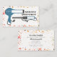 A business card featuring a terrazzo pattern background with desert inspired color scheme on front and back. Back features contact information. Front features matching blue blow dryer and curling iron for appointment time and date.