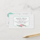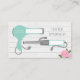 A business card featuring a gray wood background on front and back. Front features light teal frame with pink floral design. Back features matching teal blow dryer and curling iron for appointment time and date.