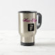 Stainless steel coffee mug with black and white shears and comb graphic. Elegant script writing in hot pink and black reads "Hair Stylist". Fabulous gift for a hairdresser, stylist, or barber