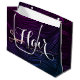 Hair Salon / Hairstylist/ Hairdresser / Beauty Salon / Makeup Artists / Scissors Planners / Event Planners / Consultants / Boutique Owners / Fashionistas Custom Gift Bags Templates - Modern Faux Rose Gold Scissors on Elegant Black and Purple Hair Pattern Background.