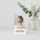 Modern hair stylist business cards featuring custom text "hair" in a modern font on a white background with a photo of a woman in a wedding dress showing her hair do.