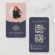 Design features your profile image, scissors logo with floral elements, your name and title on the front. The reverse side features your name, title, contact details, instagram qr code, additional qr code which can be used for phone or booking. Font, text size, colors can be customized.
