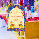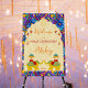 Playful Indian wedding elephants blue and yellow haldi welcome sign board, yellow pattern background, cute wedding elephants, for haldi entrance decor.