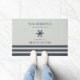 Nautical welcome door mat features a coastal style starfish and stripes design. Personalize the custom text with a family last name and beach house (or other title) with the year established. Hale navy blue and sea salt color scheme.