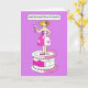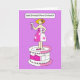 A cartoon of a lady standing on a cake. The lady and the cake are colored in different colors on either side. The lady is saying 'Half Birthday Party Invitation'.