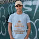 "Half Coffee Half Automobile Cleaner" on the baby blue t-shirt has a fun, cool vibe, but other shirt colors are available. The design is a smoking coffee cup at top of retro typography text with various brown shades of coffee.