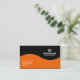 A business card with a bold wave design. Company name and business type or slogan in the header along with a monogram which can of course be changed or alternatively replaced with your logo or even a decorative symbol. Address details on the front. Name and other details on the back. Suitable for many types of business.