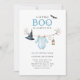 This charming Halloween baby shower invitation is the perfect way to welcome a baby boy during the cozy fall season. Featuring delicate watercolor artwork of a witch’s hat, bat, and a baby blue cloth strung across bare autumn branches, it adds just the right touch of spooky cuteness. The playful "A Little BOO Is Almost Due" headline, paired with soft neutral tones and subtle Halloween elements, makes this invite ideal for gender-themed showers with a magical twist. Sure to impress your guests and set the tone for an unforgettable baby shower!