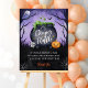 Enjoy this spooky Halloween baby shower diaper raffle sign that matches our Baby is Brewing themed baby shower collection The design features a spooky purple night sky with creepy trees, a full moon, a bubbling cauldron with bats, pumpkin and a skull.
