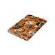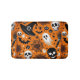 A orange colored background with scary ghosts, skulls, bats and pumpkings
