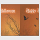 A Halloween silhouette illustration featuring spooky black bats and creepy trees with a drippy "Happy Halloween" Greeting on a mystic orange background.